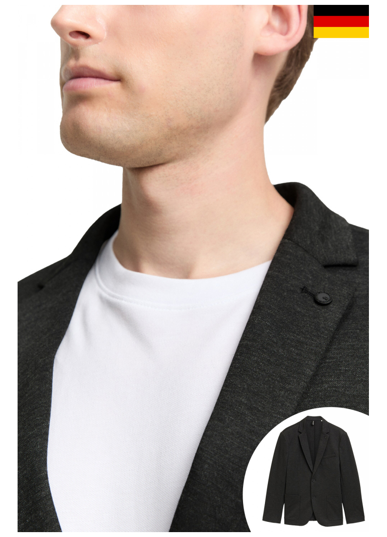 Normál fazonú zakó, elülső rávarrt zsebekkel, díszes zsebbel a mellkason és paszományos zsebbel a belsején. Texturált, rugalmas piqué anyagból készült, kényelmes viseletet biztosítva.